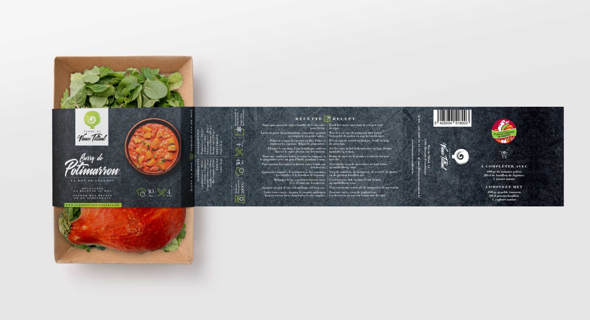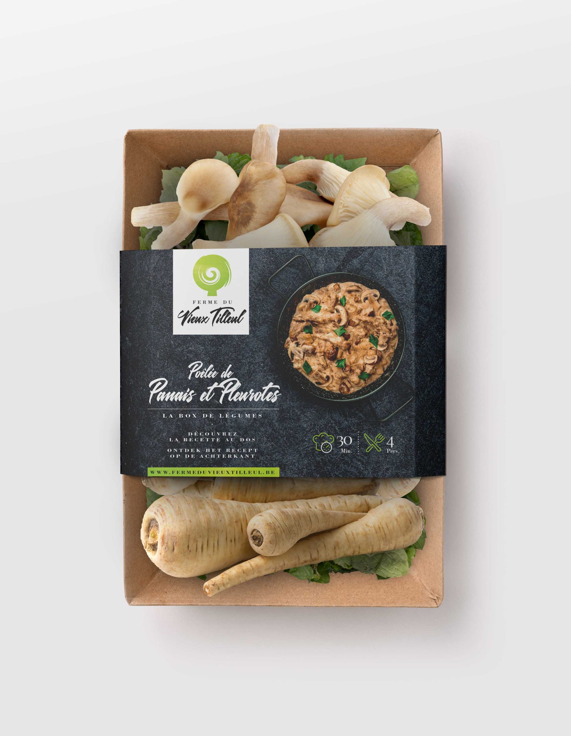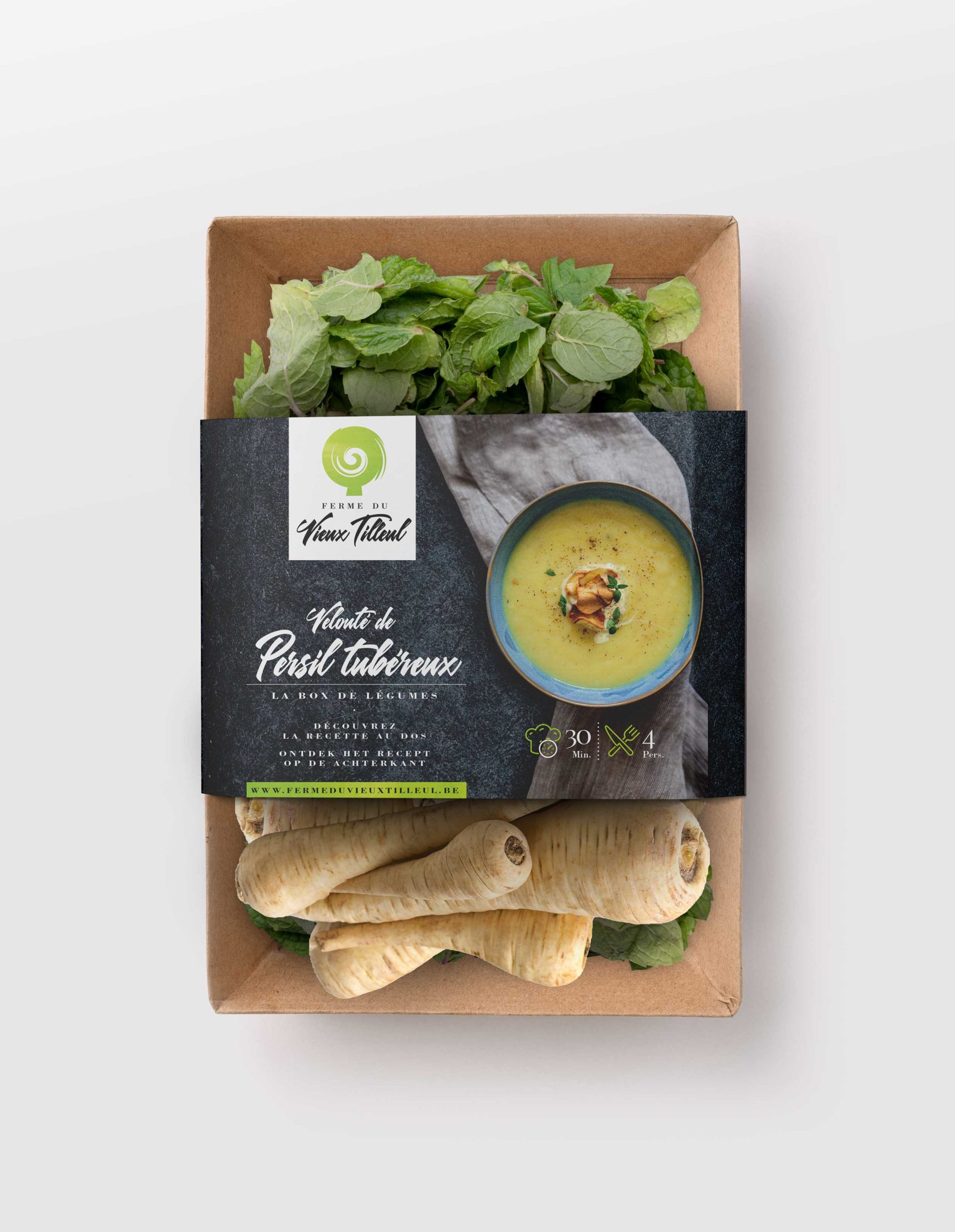 Création complète du packaging des box de légumes bio pour la Ferme du Vieux Tilleul (Fernelmont).