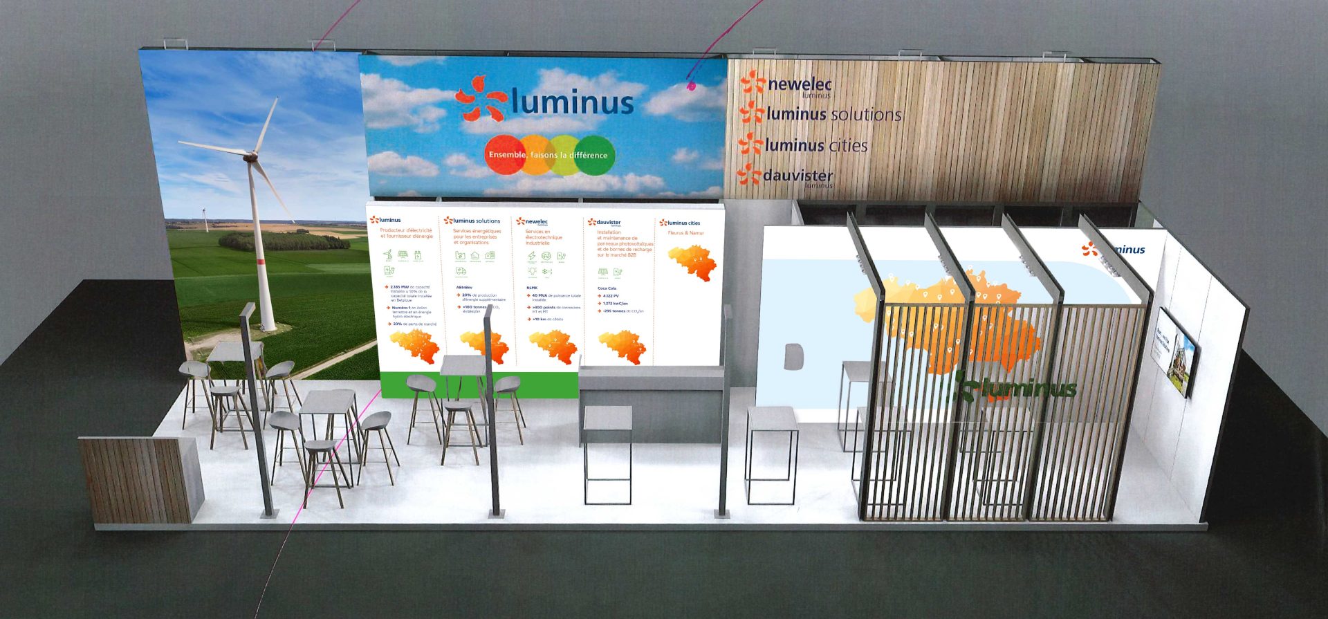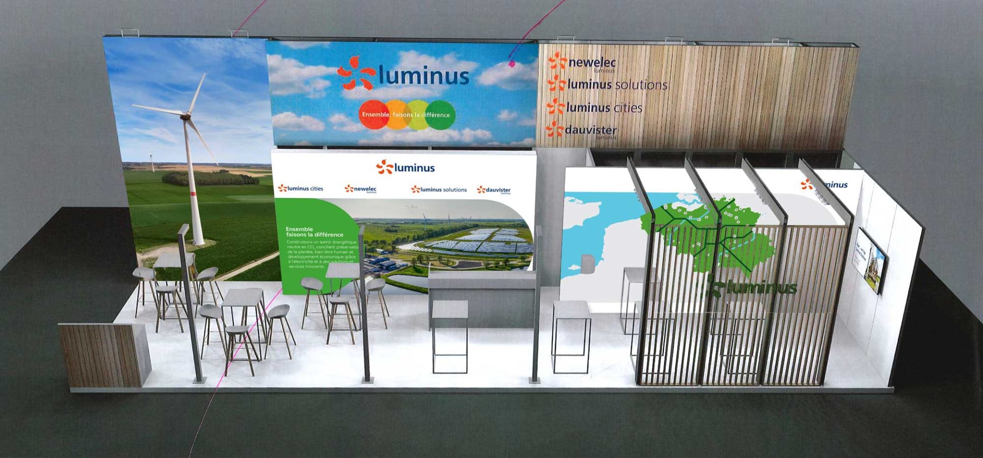L’objectif : créer un stand clair, impactant et cohérent avec l’image de marque, tout en valorisant l’expertise énergétique de Luminus auprès des décideurs publics.