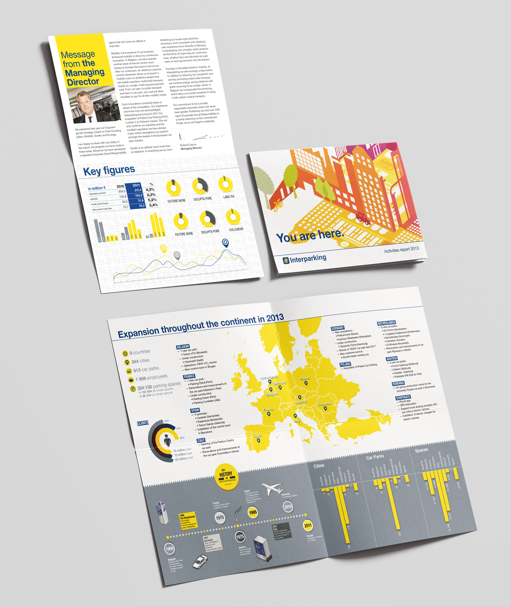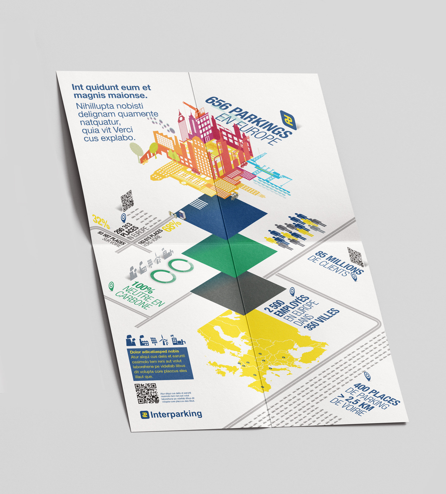 Projet de map folder pour Interparking, destiné à présenter de manière dynamique et colorée les chiffres clés du rapport annuel.